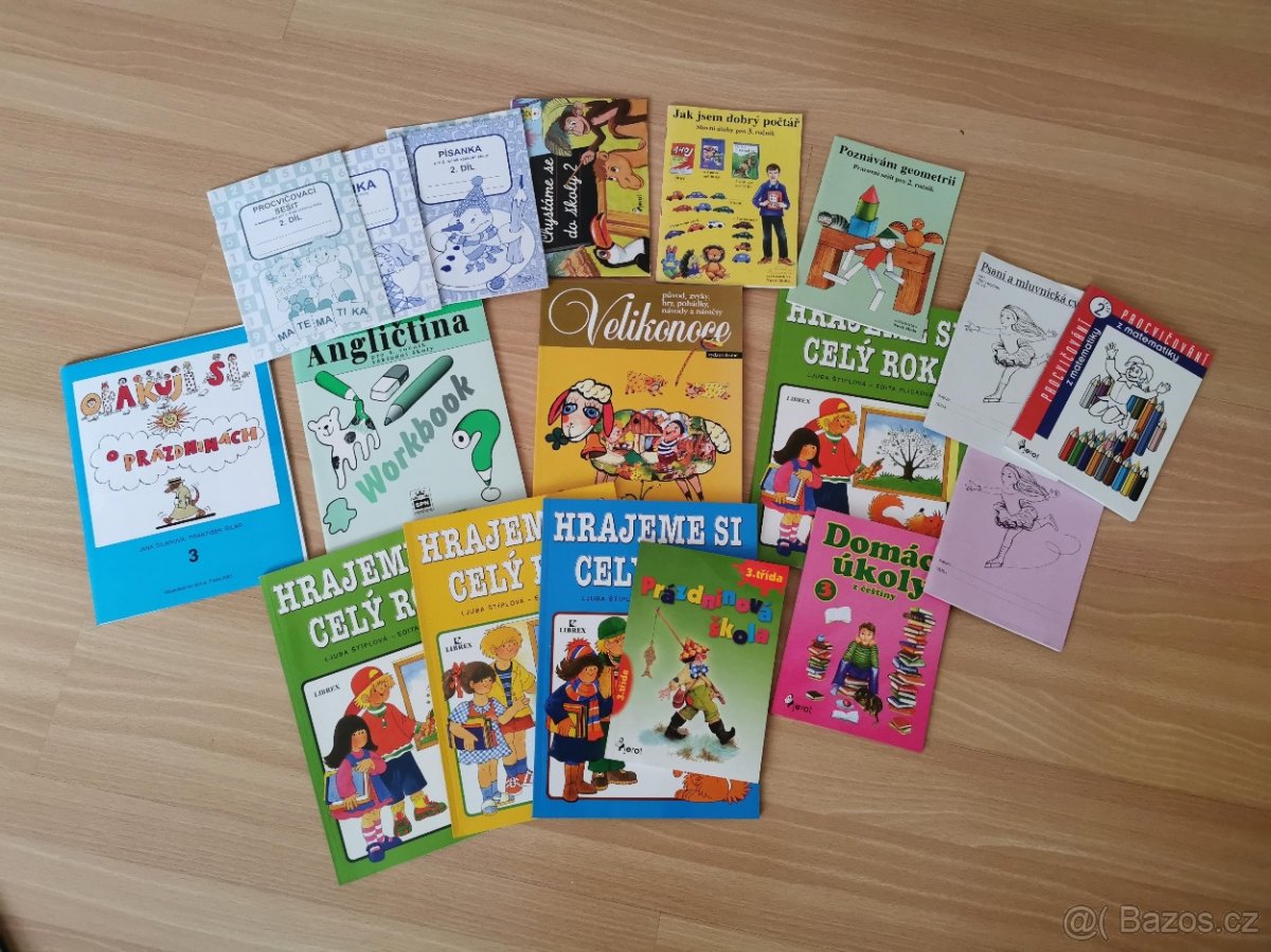 Mix různých procvičovacích knih a sešitů.