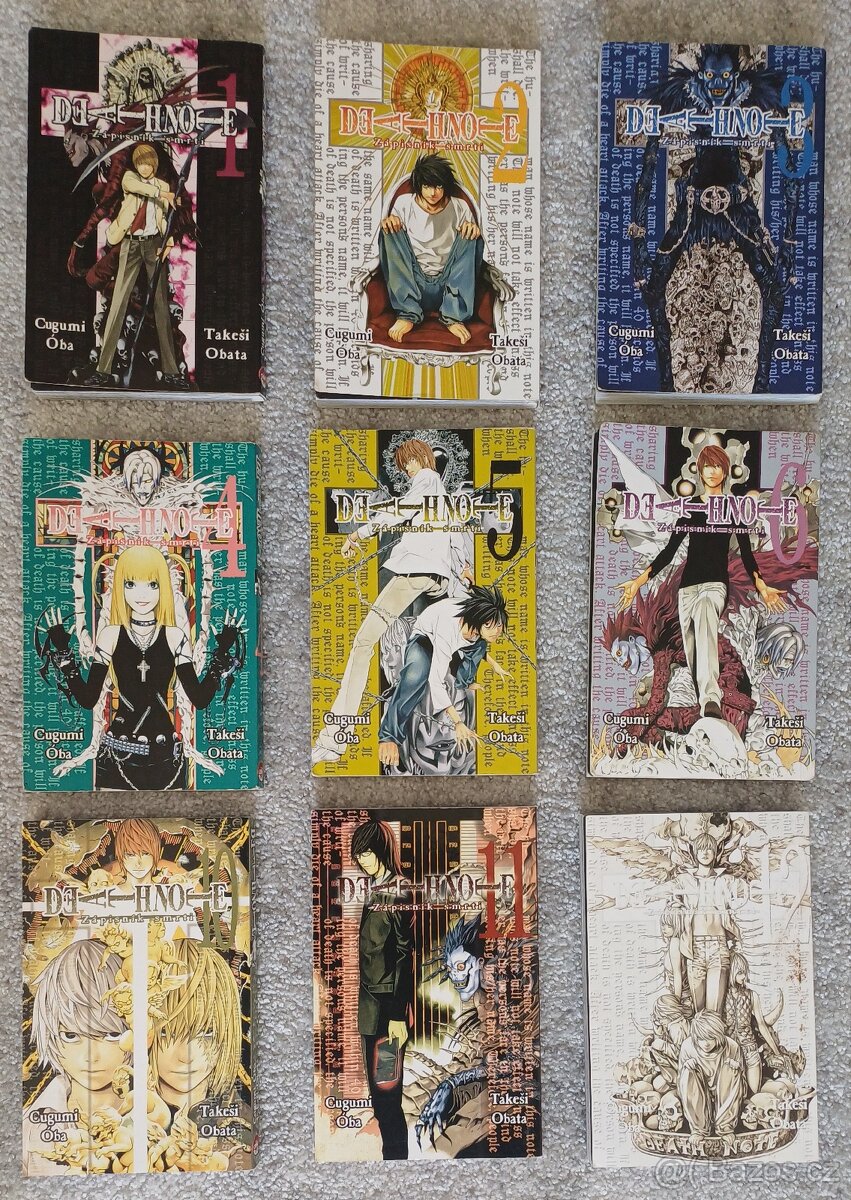Knihy death note díly 1-6 a 10-12 (chybí 7,8,9) dohromady 9 knih. Jedna za 99kč, všechny za 789kč.